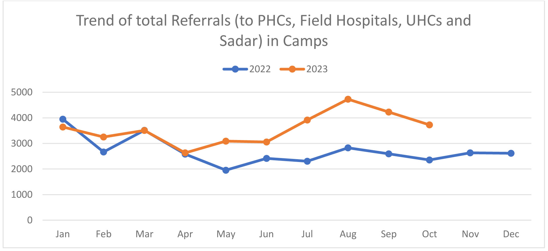 Figure 2: Trend of total referrals (to PHCs, Field Hospitals, UHCs and Sadar) in camps.