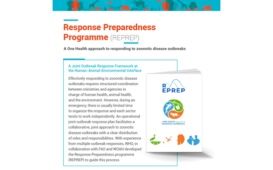 Zoonotic diseases are transmitted between animals and people and impact health, livelihood, and national and global health security. Effectively responding to zoonotic disease outbreaks requires structured coordination between ministries and agencies in charge of human health, animal health, and the environment. However, during an emergency, there is usually limited time to organize the response and each sector tends to work independently. Using returns of experience from multiple outbreak responses, WHO, in collaboration with FAO and WOAH developed the Response Preparedness programme (REPREP) to support countries in developing a multisectoral outbreak response framework. An operational joint outbreak response plan facilitates a collaborative, joint approach to zoonotic disease outbreaks with a clear distribution of roles and responsibilities.