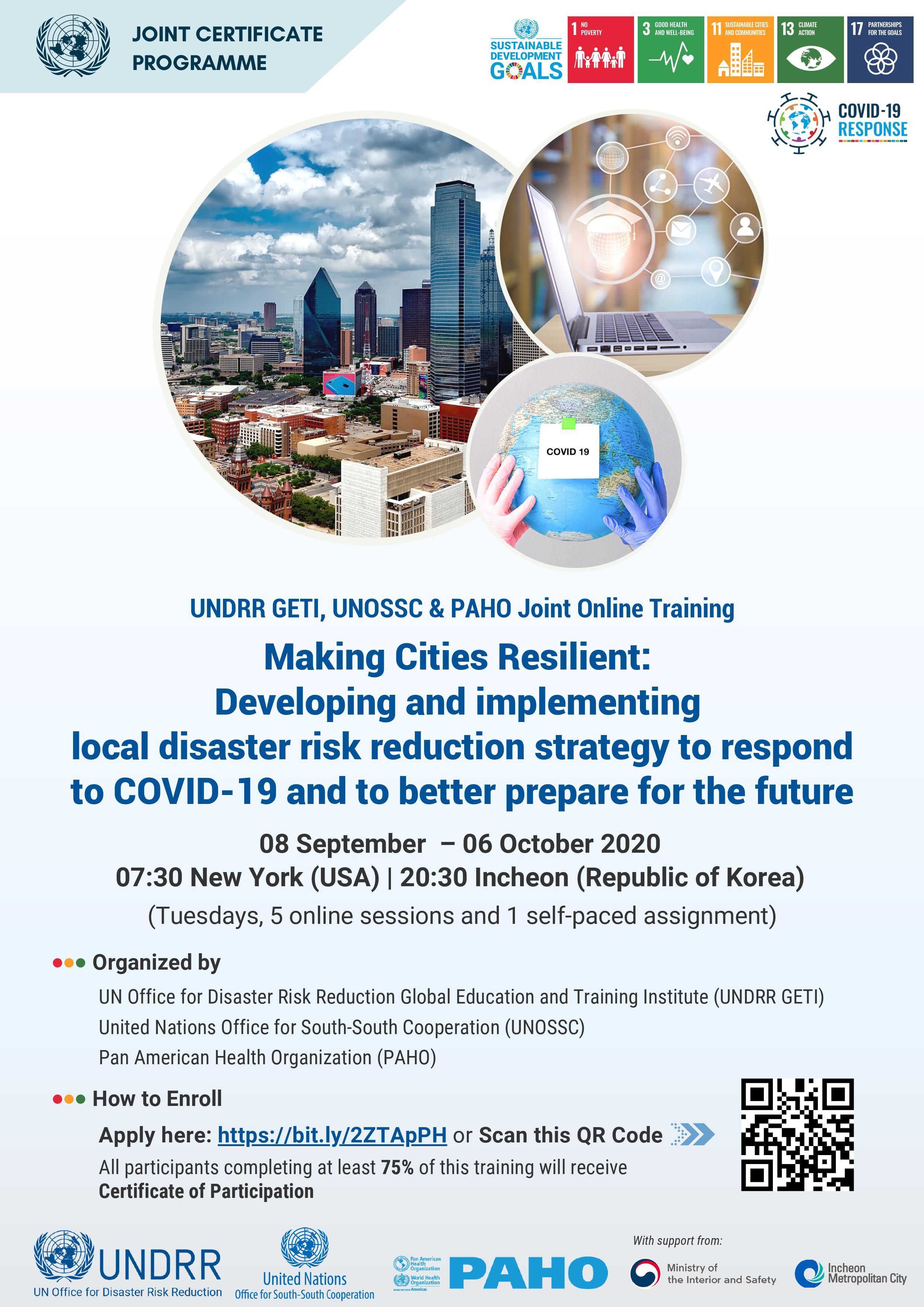 Local and national government officials in charge of disaster risk reduction and management, urban development and planning; national associations of municipalities; urban resilience practitioners as well as civil society, private sector, and academia. The course is open to all applicants from both developed and developing countries, especially the young experts and officials. Participants from Least Developed Countries (LDC) and Small Island Developing countries are highly encouraged.