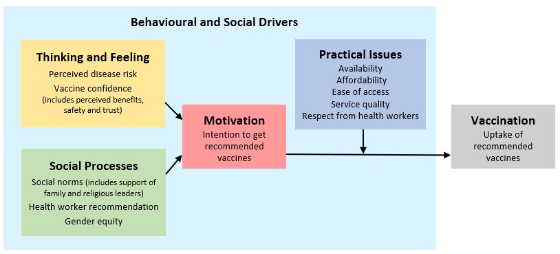 A range of factors influence whether a person is vaccinated or not. The framework of behavioural and social drivers (BeSD) of vaccine uptake (see below chart) illustrates the four domains that can be measured to understand reasons for under-vaccination. The