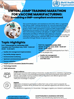 There is a need for local manufacturers in many LMICs to build capacity in producing quality-assured medical products to help improve access and strengthen medical products security. In response to Member States’ requests for support to address this need, the Local Production & Assistance Unit (LPA) organizes Virtual cGMP Training Marathons in a yearly basis to provide concepts on selected cGMP topics, facility design, technology transfer and Quality Management System skills aimed at managing current regulatory expectations for medical products manufacturing.